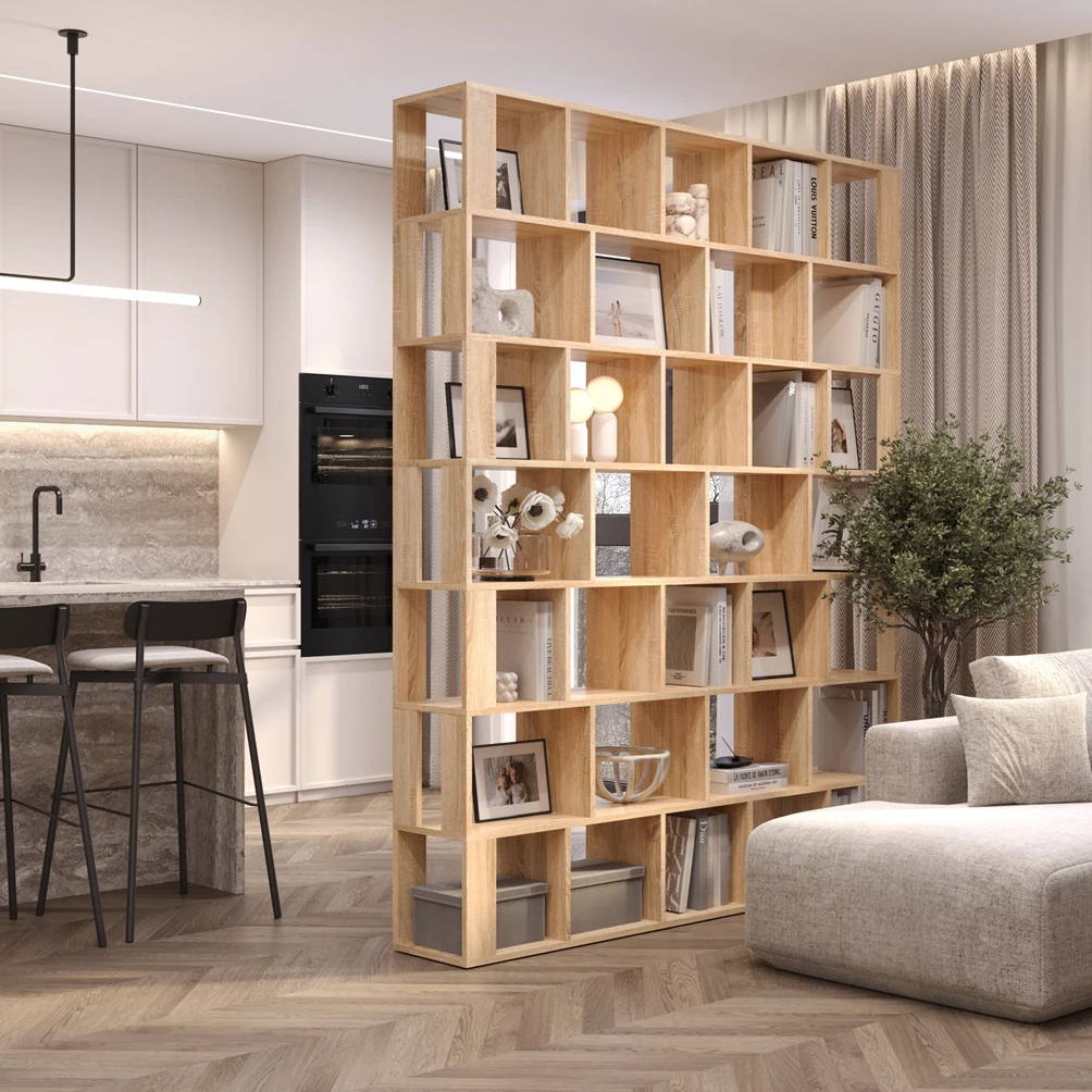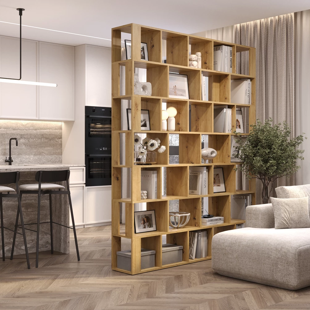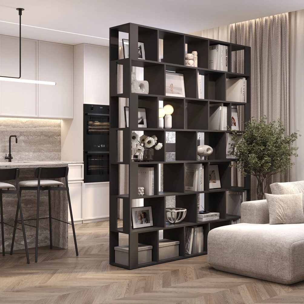 Wyobraź sobie, że jednym meblem oddzielasz strefę jadalnianą od wypoczynkowej lub tworzysz intymny kącik do pracy w sypialni. Dzięki temu, że jest to regał wykończony ze wszystkich stron, nie musisz ustawiać go pod ścianą. Wygląda fenomenalnie z przodu, z tyłu i z boków, stając się centralnym punktem Twojej aranżacji.