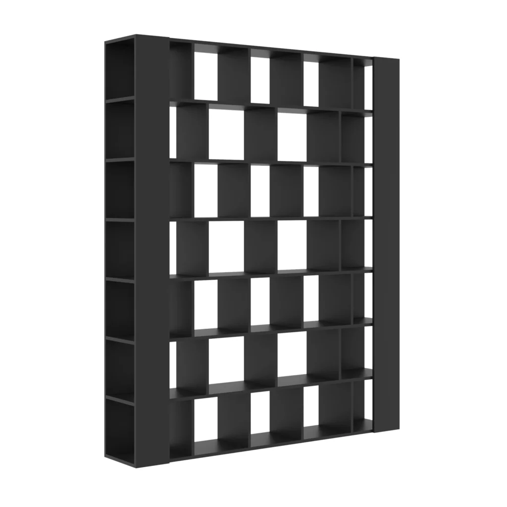 W nowoczesnych aranżacjach regał czarny pełni rolę mocnego elementu stylistycznego. Czerń jest kolorem ponadczasowym, który doskonale kontrastuje z jasnymi ścianami, drewnem czy betonem architektonicznym. Dzięki temu regały czarne przyciągają wzrok i stają się jednym z głównych punktów aranżacyjnych salonu, bez konieczności stosowania dodatkowych dekoracji.